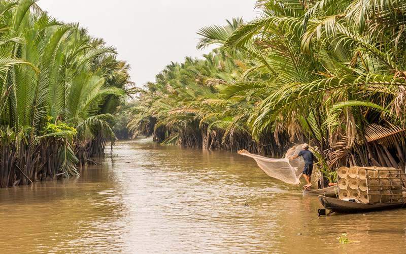 Después, navegará por el río Tien para experimentar de cerca la vida en el Delta del Mekong. Recorrerá 4 pequeñas islas: Fénix, Unicornio, Dragón y Tortuga. Contemplará los frondosos árboles tropicales y las típicas casas sobre pilotes de los pueblos pesqueros mientras se abre paso por los angostos canales en una barca de remos.