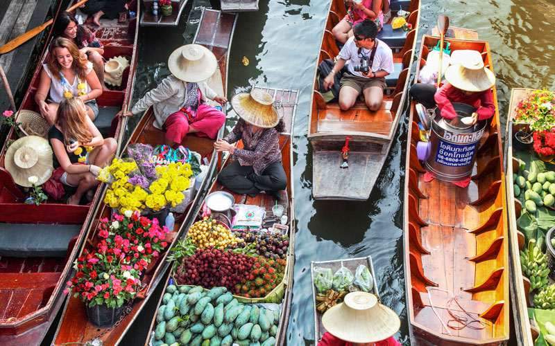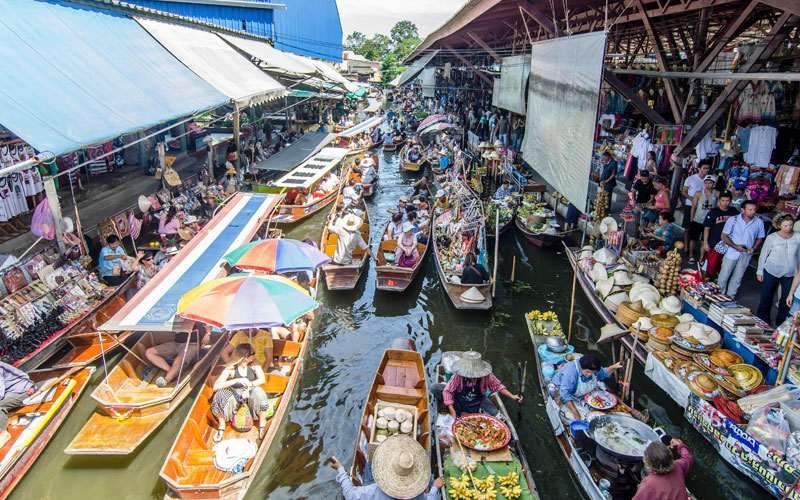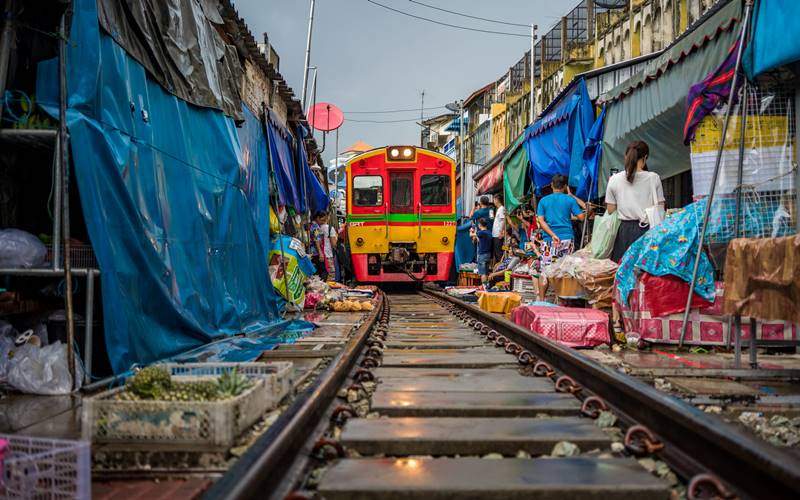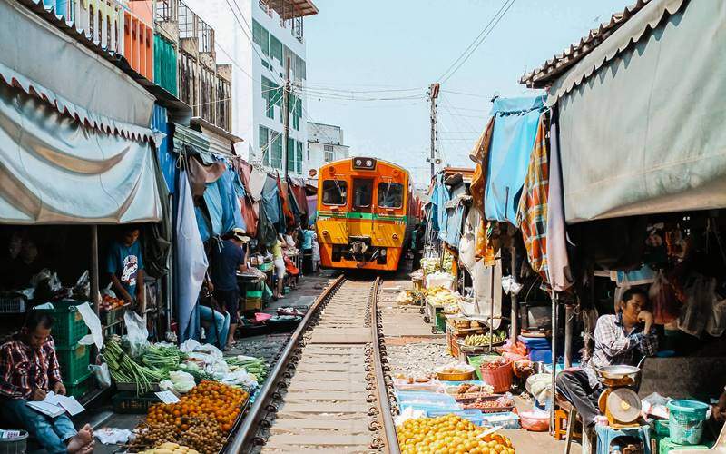 Encuentro con el guía en la recepción de su hotel y traslado a 80 km al sudoeste de la ciudad para visitar el famoso mercado del tren. Observe como al acercarse el tren al mercado los comerciantes repliegan sus puesto de ventas para permitir al tren cruzar por el medio del mercado! Una vez finalizada la visita, nos dirigiremos al mercado flotante de Dammnoen Saduak. Allí tomaremos una barca para navegar por los canales hasta llegar al mercado y observar como se comercia con fruta, verduras, etc.