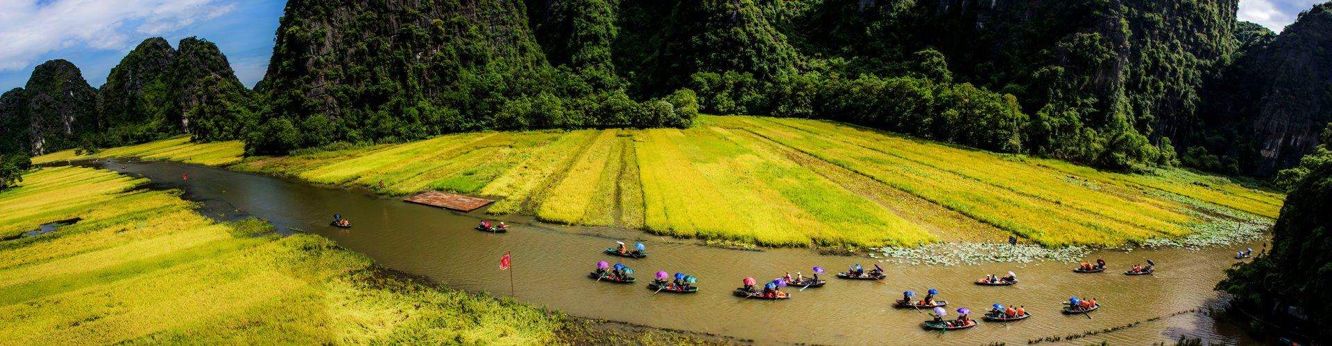 Ninh Binh es una ventana fascinante a la belleza simple del campo vietnamita. A poco más de una hora en coche de Hanoi, es un destino imprescindible para aquellos que desean perderse en un paisaje pintoresco salpicado de carreteras serpenteantes entre montañas de piedra caliza cubiertas de un fresco tono verde, lagos, ríos y arroyos que fluyen a través de aldeas y pequeños pueblos rodeados de campos de arroz exuberantes o dorados.