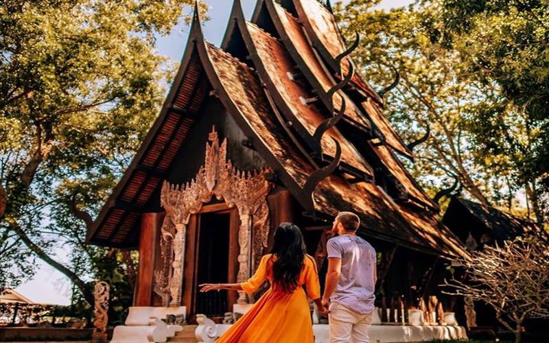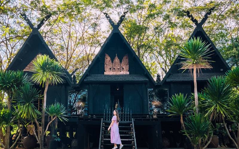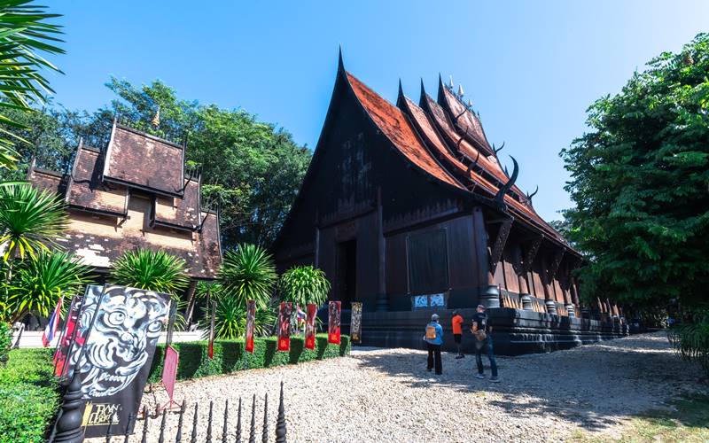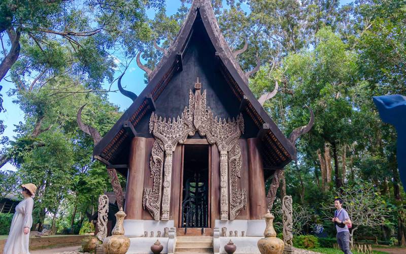 Espalhadas pelas instalações, encontram-se estruturas de madeira escura com telhados altos, incorporando a essência da arquitetura tradicional Lanna. Os edifícios de madeira de teca pintados de preto, embora visualmente impressionantes, evocam uma sensação de misticismo e profunda introspecção.