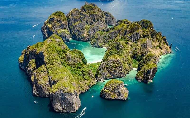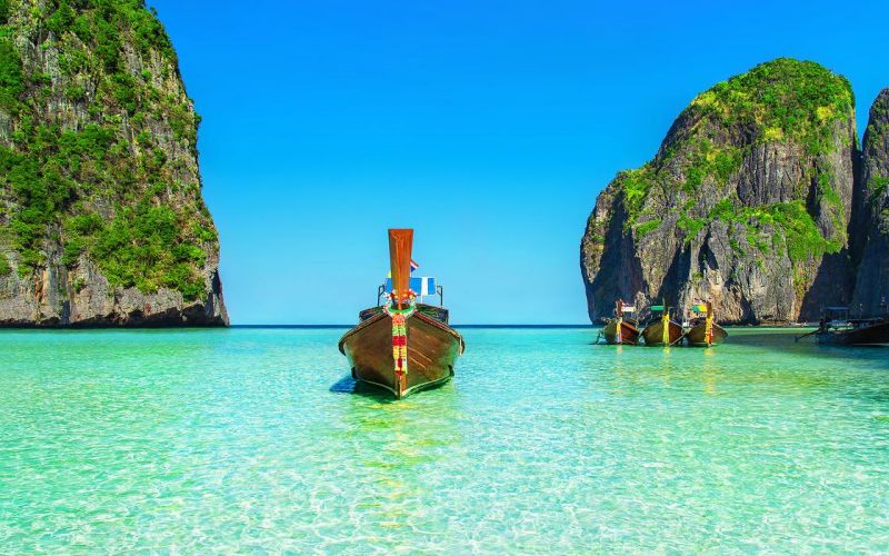 Maya Bay, imortalizada no filme A Praia (2000) com Leonardo DiCaprio, é considerada uma das praias mais deslumbrantes do mundo, com areia branca fina, águas cristalinas e falésias de calcário impressionantes.