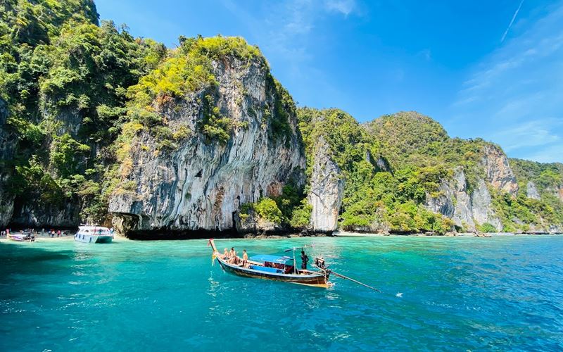- Mar calmo e cristalino: as águas tranquilas facilitam o trajeto de barco até a praia e tornam o passeio mais seguro e confortável, especialmente com os tradicionais barcos long tail.