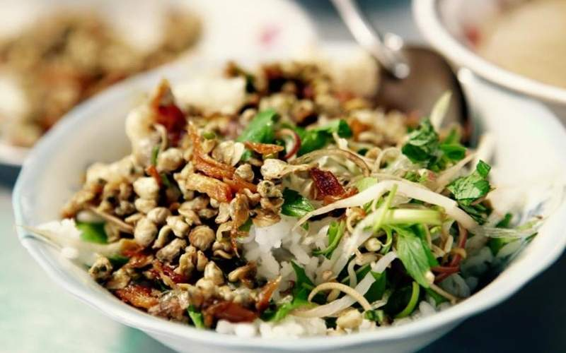 Com chay cha bong (biscoito de arroz crocante com carne picada): a cor de marrom dourado dos biscoitos de arroz com carne de porco seca desfiada no topo e sua crocância é tão apetitosa que faz você não conseguir resistir.