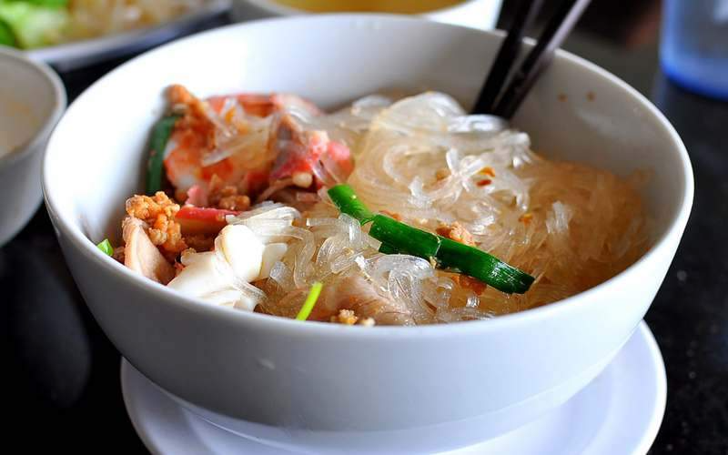 Hu tieu: é o prato mais típico da Cidade de Ho Chi Minh. Macarrão de arroz fresco misturado com um saboroso caldo de porco com carne de porco e frutos do mar variados (camarão, caranguejo, etc.), sendo servido com cebolinhas e brotos de feijão frescos.