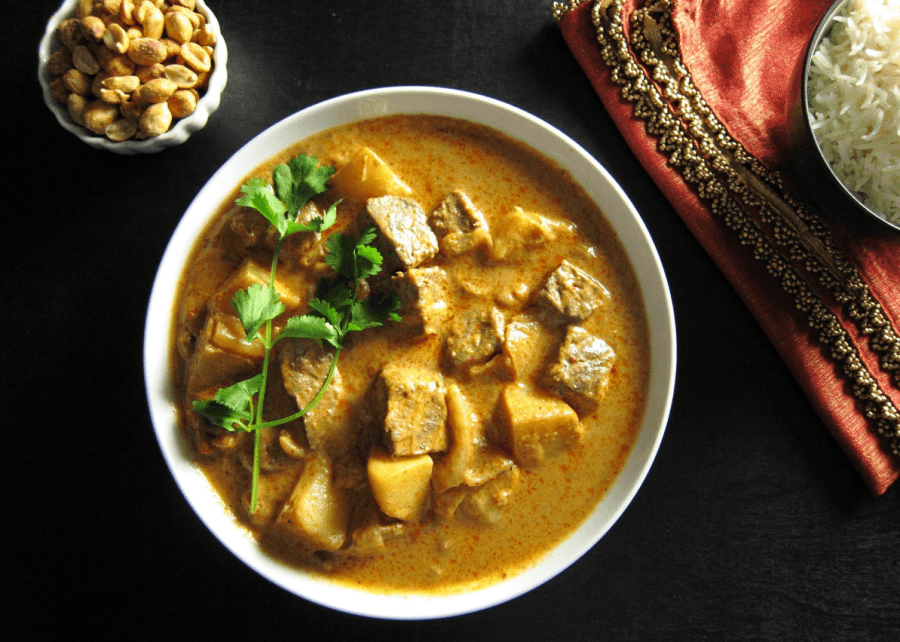 Caril Massaman cujos ingredientes são bife, tofu, amendoim, leite de coco, batata, molho de peixe e molho de tamarindo