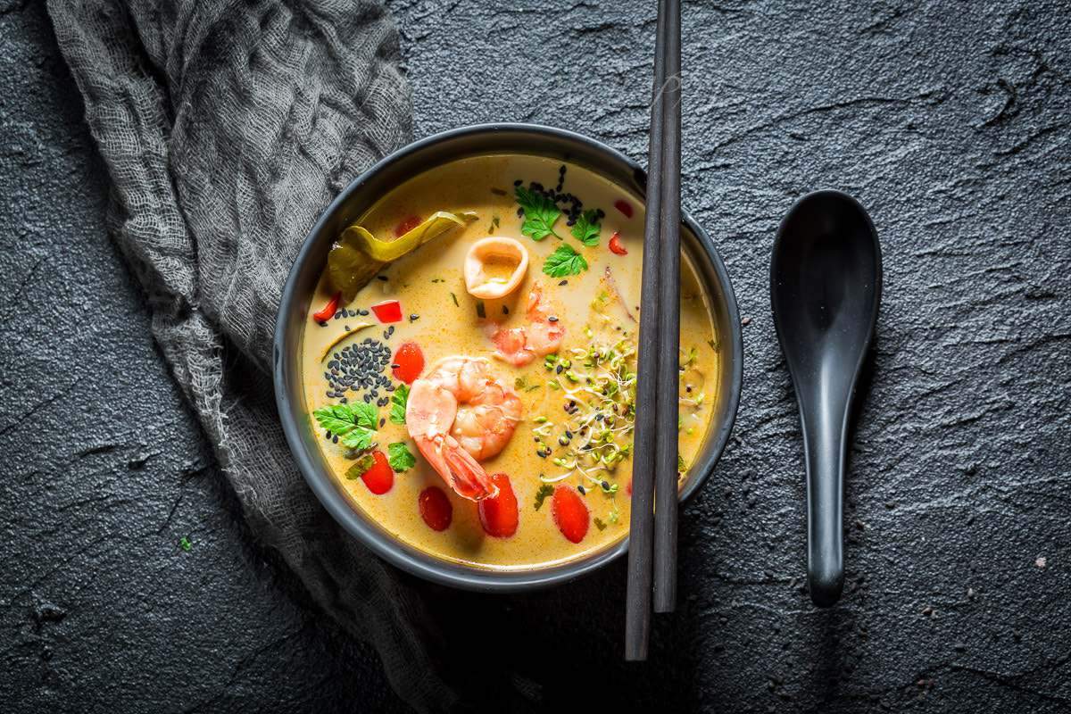 Tom Yum Gum, que é a sopa tailandesa com camaraões, cogumelos, tomates, capim-limão, galanga e folhas de limão.